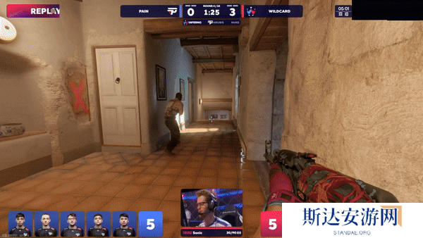次回合paiN强起失败进入经济局。来到上半场第一个长枪局,土匪抱团飞二楼,道具铺满CT没有枪位,吹风机拉开枪线,,最后剩余biguzera一人直接保枪,Wildcard拿到4-0开局。第六回合,土匪控中路道具没有给到位,被CT交叉击杀三人,最后两人也被架住,paiN拿到第一分,比分来到1-5。但接下来土匪没有给到CT机会,拿到信息立马抱团打补枪进包点,Wildcard连续拿分至7-1。但九回合,CT打乱了土匪的进攻节奏极限时间打死包匪,paiN开始追分。上半场最终局,双方蕉道一换一,CT急于拿信息被土匪连接两人,但二打四的CT互相配合牵制对手,nqz一把大狙双杀,半场结束Wildcard以7-5比分暂时领先。