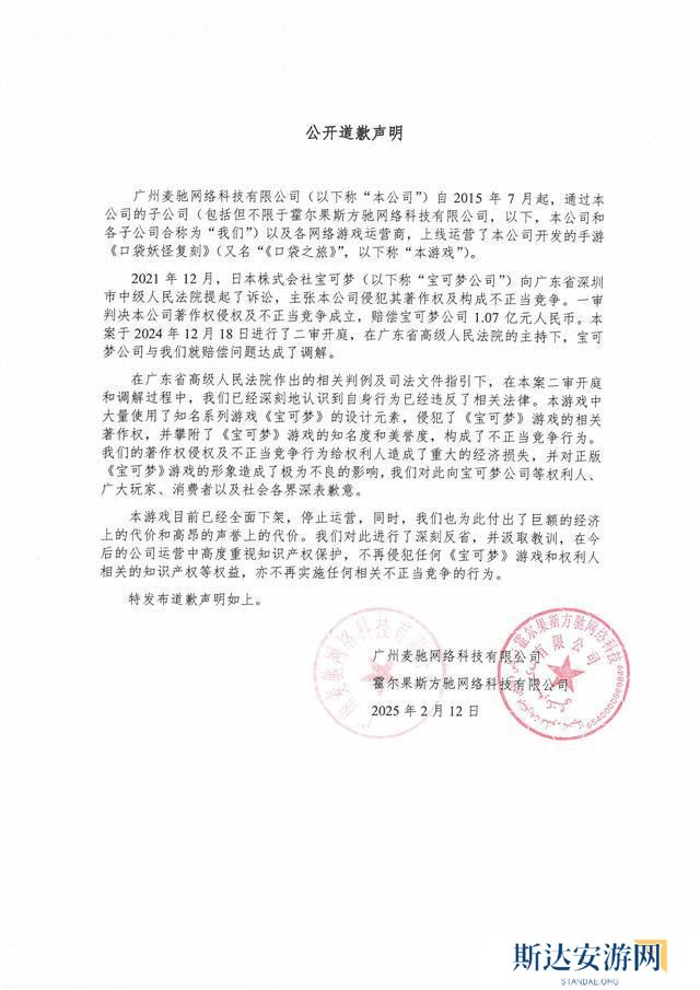 据澎湃新闻报道,广州麦驰网络科技有限公司,作为盗版游戏《口袋妖怪复刻》的开发者,近期已正式向宝可梦公司致歉。目前,该游戏已全面从市场上撤下并停止运营。