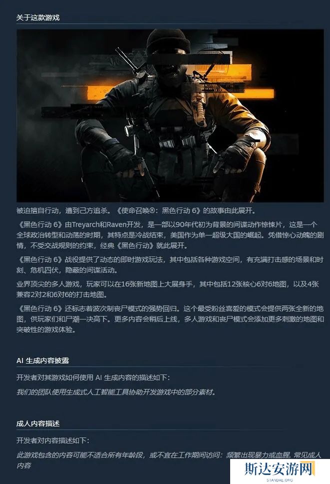 动视暴雪公司近日确认,在《使命召唤》系列游戏中使用了生成式AI技术开发部分美术资源。这一信息并非通过官方声明发布,而是由玩家在Steam平台页面底部发现的相关披露内容。