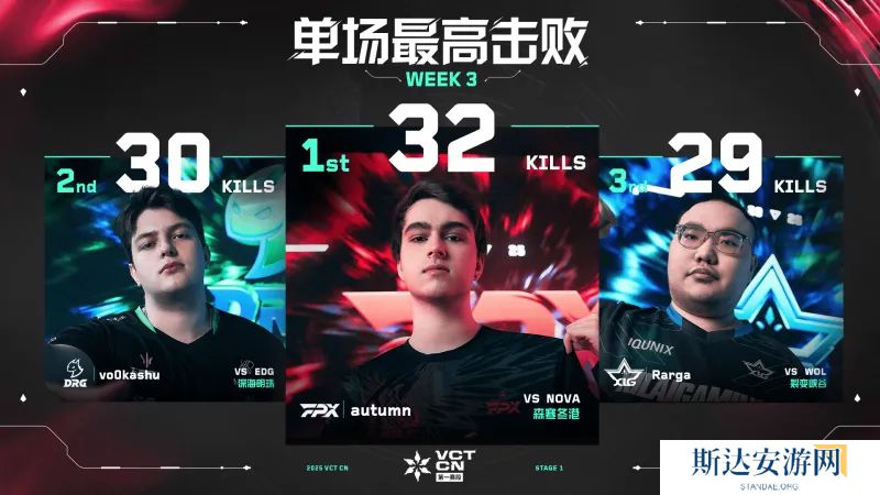 2025 VCT CN联赛第一赛段第三周最佳数据排行:本周最亮眼的数据分别是以单场维度统计的击败数、平均每回合伤害以及团队贡献率。