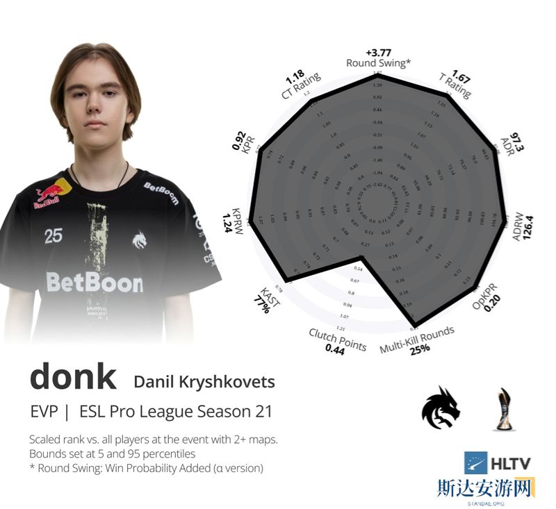 donk在小组赛阶段的rating为1.74,不可否认,正是这样的表现为他赢得了EVP荣誉——这种在小组赛中的状态极为出色,以至于早早锁定了这一奖项的案例十分罕见。