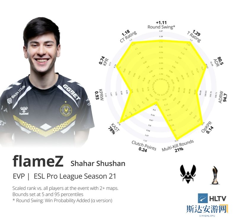 flameZ是那种罕见的总能在淘汰赛中挺身而出的选手,这次也不例外,他在小组赛中的rating为平平的1.13,而在淘汰赛中达到了1.33。