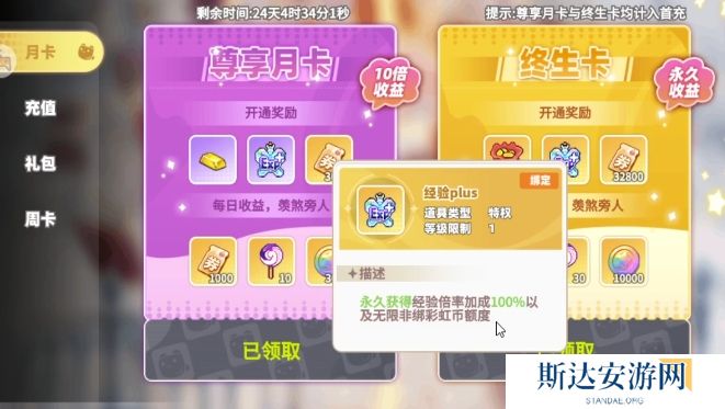 大家购买月卡或终生卡之后,除了直购时会有相应的点券返还这一福利之外,每天还能领取到4000点券,这相当于40米的价值,让大家在游戏中的经济来源更加稳定,同时还能享受到彩虹币11%的兑换率以及经验11%的倍率加成,这也提升了资源获取效率和角色成长速度,其次周卡也是一个相当不错的选项,每周只需花费18米,就能获得副本卷、称号以及点券等实用道具,性价比高。