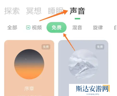 2、在打开的新页面中,选择上方的声音,点击其中的免费图标。