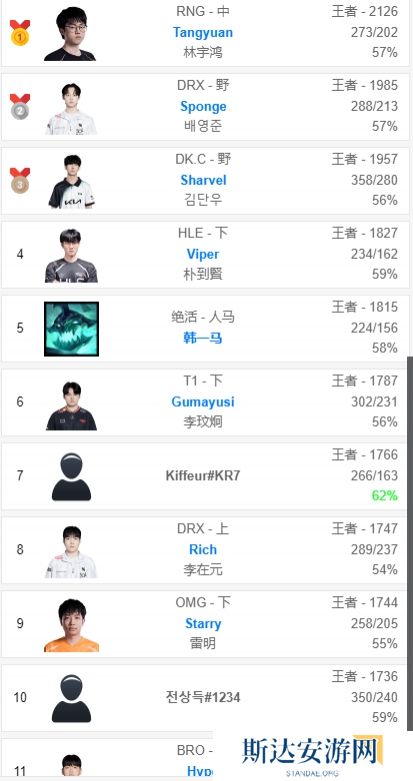 直播吧5月9日讯 韩服前十榜更新,LPL选手RNG中单Tangyuan以2126分位居第一,OMG下路Starry以1744分位列第九,LCK选手DRX打野Sponge第二、DK二队打野Sharvel第三,HLE下路Vipere第四、T1下路Gumayusi第六,DRX上单Rich第八。