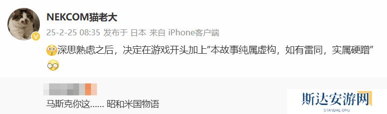 马斯克的这一举动迅速吸引了猫老大的注意。他调侃地表示:“在深思熟虑之后,我们决定在游戏开头加入一句提示:‘本故事纯属虚构,如有雷同,实属硬蹭。’”