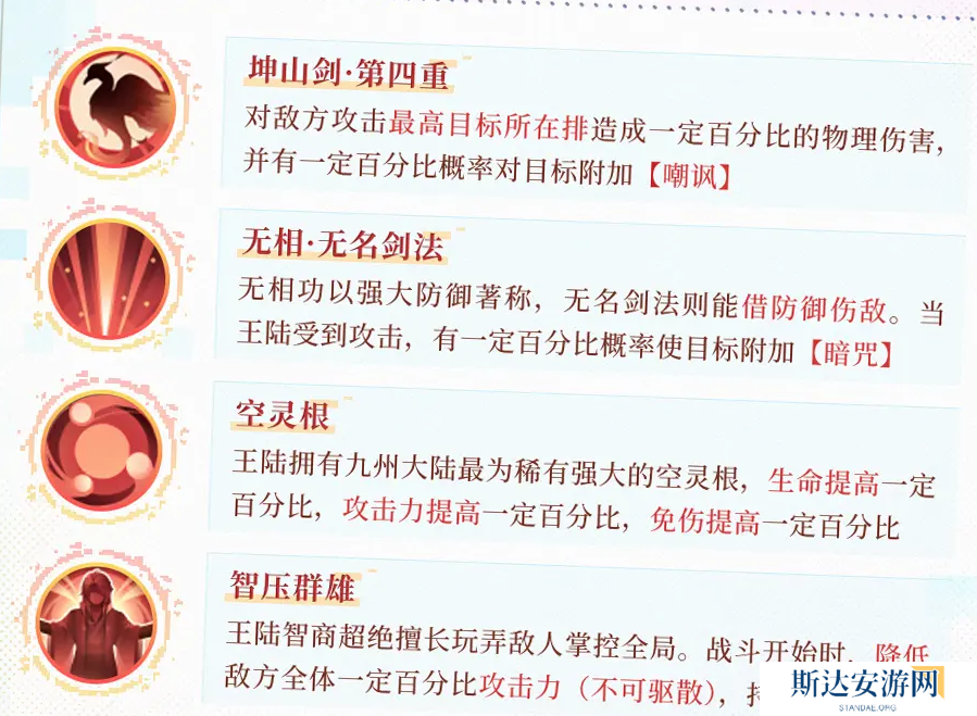 王陆智商超绝擅长玩弄敌人掌控全局。战斗开始时,降低敌方全体一定百分比攻击力(不可驱散),持续一定回合。王陆死亡后会以一定生命值复活,并为自身附加【运筹帷幄】,每场战斗触发1次