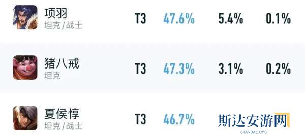 比如,项羽,猪八戒和夏侯惇,就排在倒数前三,尤其是夏侯惇,直接从49.5%下滑至46.7%,降幅高达2.8%,真的夸张。