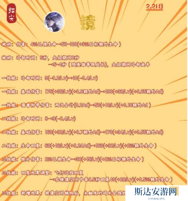 被动技能大招期间冷却减半,且后期降低技能冷却,三个技能的数值全部重新调整,加强基础和成长伤害,削弱AD,降低镜纯输出的高爆发,鼓励走半肉流的玩法。