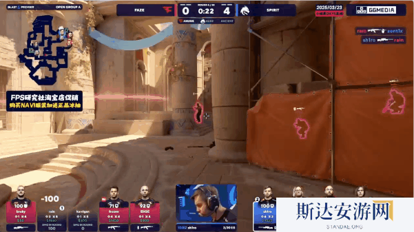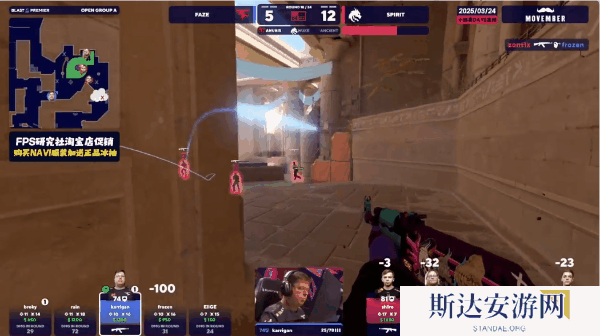 手枪局,Spirit作为T方速提A包,燕双鹰frozen发力回防三杀拿下第一分。下一回合,Spirit强起给到donk英雄AK,EliGE身法秀猛跑K1偷掉红箱两人锁定胜局。Spirit被迫ECO让分。第四回合,FaZe外场前压被连续接下,剩下两人被迫保枪。比分来到3-1,FaZe强起刚枪,双方外场一换一后rain在K1非预瞄位接下donk,frozen提前预判zont1x转点拿下1v1残局。长枪局,Spirit黄房爆弹,donk配合队友道具瞬间融化A包防守CT,broky和frozen哥俩再次一起保枪。第七回合,FaZe强起刚枪,Spirit速提铁板,broky致命空枪放人无伤进B丢掉回合。FaZe只能ECO养经济。第九回合,zont1x两波混烟混死两人,FaZe直接放弃3v5回防保枪。下一回合,练枪rain非常规前顶匪厅下起倾盆大雨拿下双杀,Spirit剩下三人抱团进A抓到rain的timing,FaZe再次选择保枪。第十一回合,FaZe经济不佳缺少道具防守,只剩下rain钻烟被绝望混死。上半场最后一回合,FaZe全员枪法发挥防守补枪滴水不漏拿下回合。上半场Spirit以7-5暂时领先。