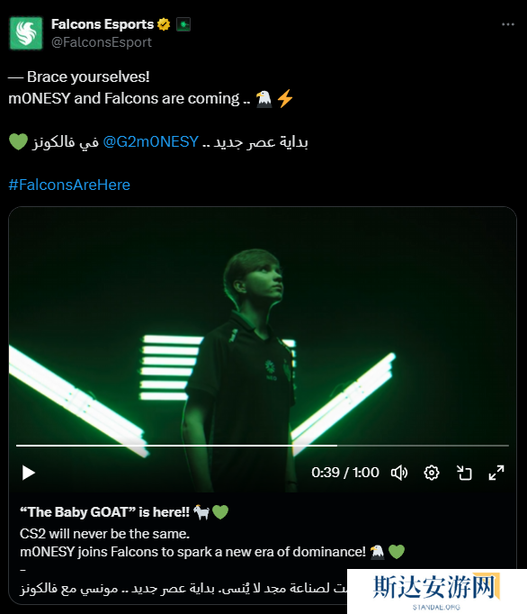 Falcons阵容中,m0NESY将与昔日G2队友NiKo重聚。这对搭档曾在2022年1月至2024年12月期间并肩作战,联手斩获六座冠军头衔——直至这位波黑巨星离开G2、转投Falcons。