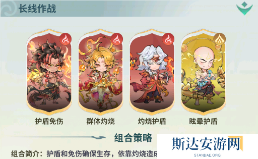 优势:唐僧提供全体增益(持续治疗、抵御、完全抵抗、免伤提升、抗暴提升中随机一个)和给重要输出角色提供护盾,并且攻击概率附加眩晕,保证己方的站场。另外三名【灼烧大将】攻击附加灼烧的同时也能给自身或者全体附加护盾等增益,敌方只能败于灼烧的折磨。