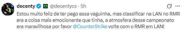 decenty:我很高兴能晋级Major,但在RMR的线下赛中晋级是我经历过的最激动人心的事情,那时的比赛氛围真是太棒了,请官方恢复线下赛RMR!