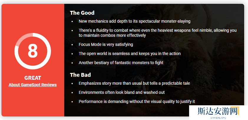 昨晚,《怪物猎人:荒野(Monster Hunter Wilds)》媒体评分正式解禁,GameSpot对其进行了评测,并打出了8分的评价。