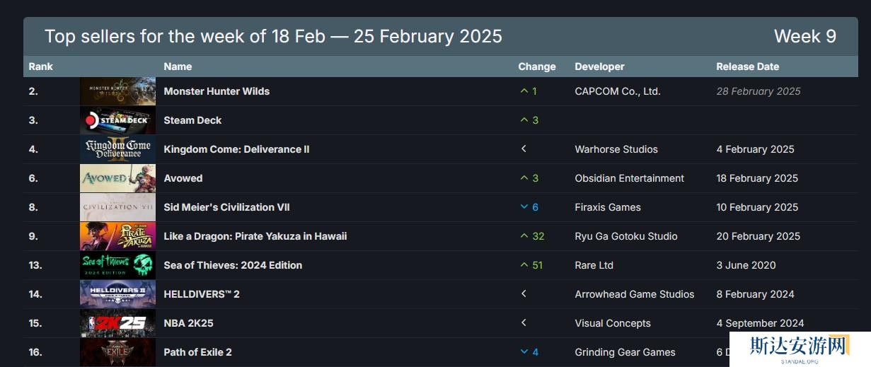 Steam公布了新一周畅销榜(2025年2月18日-2025年2月25日),《怪物猎人:荒野》还未正式发售便已登顶榜首,而新发售的《宣誓》以及《如龙8外传》也进入榜单前十,分别位列第四和第六。