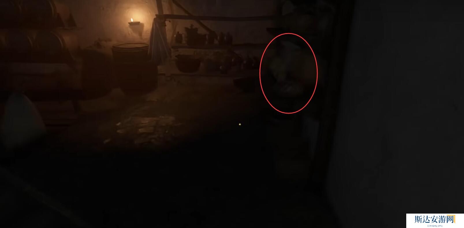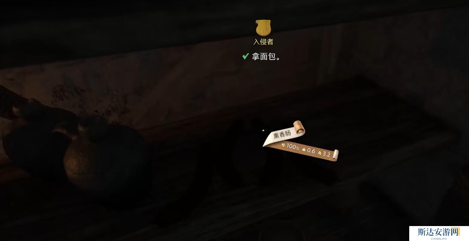 3、进去后开右上的门,在里面的架子上拿到面包;