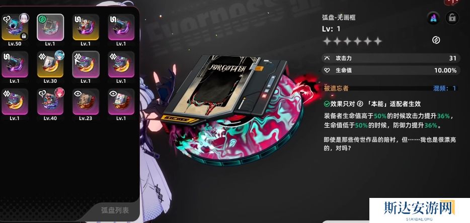 无画框是一件极具特色的武器,其精通效果与装备者的生命值状态紧密相连,当装备者生命值高于50%时,无画框能够提升攻击力,为装备者在生命值较为健康的情况下提供强大的输出能力,而当生命值低于50%时,无画框则会增加防御力,随着精通等级的提升这种攻击力和防御力的加成效果也会从精通1的攻击力和防御力提升36%,到精通5的提升72%。