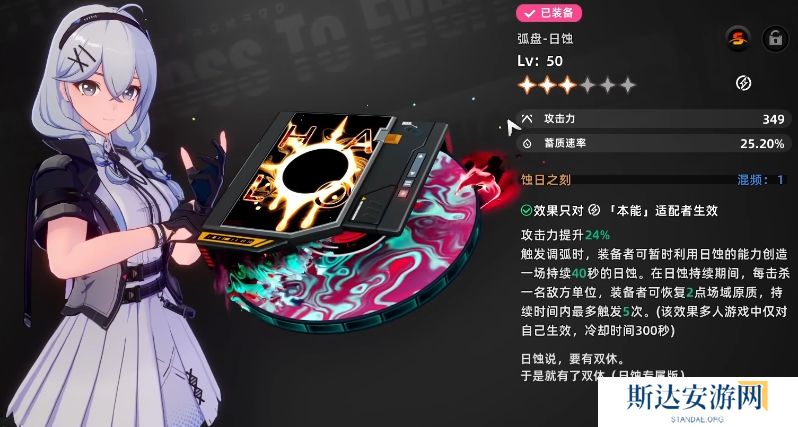 日蚀是一把能够操纵黑暗能量的武器,当装备者触发调弧技能时,日蚀的力量会被完全激发,周围空间瞬间陷入一片黑暗,形成一个持续20秒的日蚀领域,在这个领域内敌人的生命力似乎被黑暗所吞噬,每击杀一名敌方单位,装备者都能感受到一股神秘的能量涌入体内,转化为场域原质,最多可触发5次,随着装备者对日蚀的精通程度提升,日蚀的力量也会更加强大,从最初的攻击力提升24%,到最终的48%。