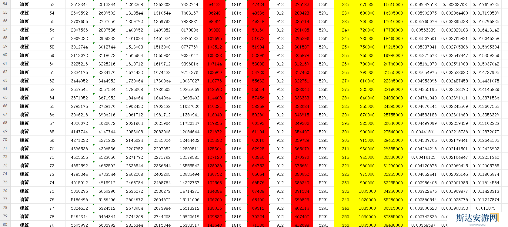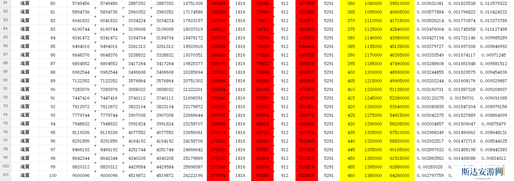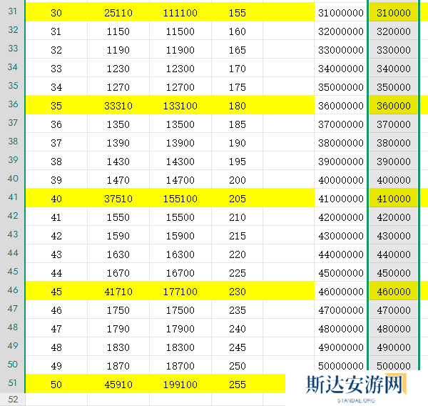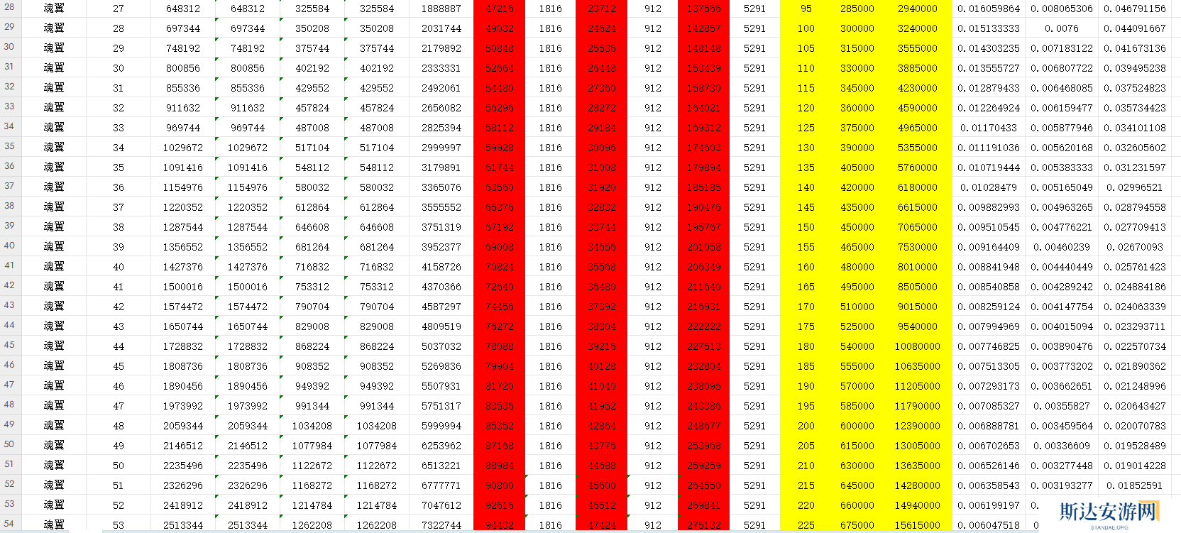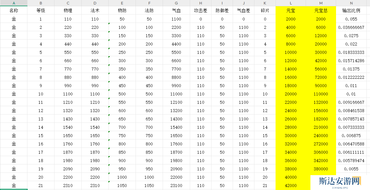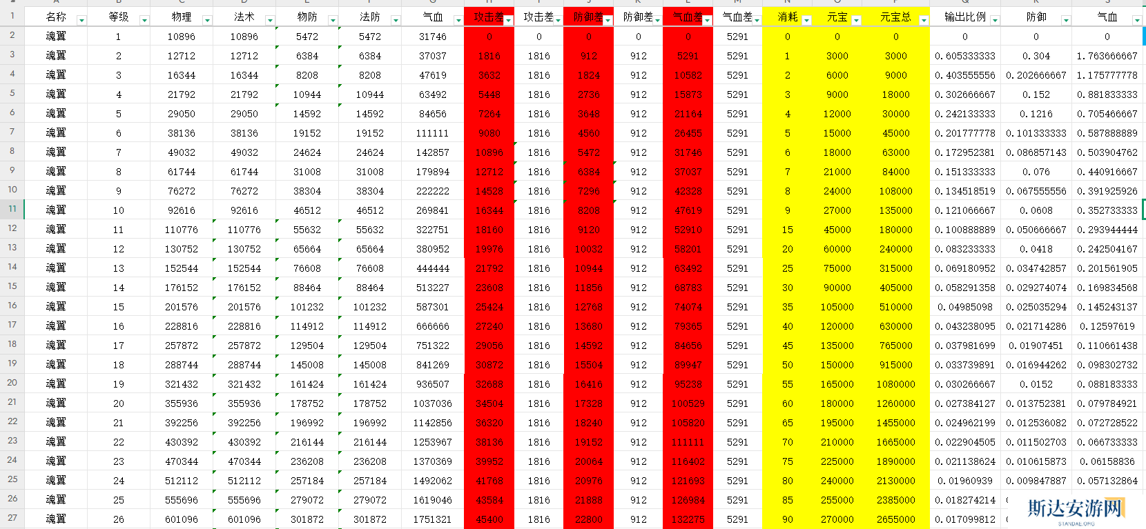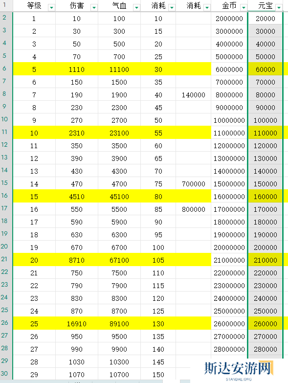 这个是一到100级的属性成长,除了消耗后续可能有变化,但是这个功防御血量是100%准确的,以及每提升以及所需要的元宝消耗,和总元宝转化率都有,那么通过这个我们可以很清楚的知道当前的元宝用来提升什么,通过表格我们不难发现1-10级的消耗是最低的,所以放心梭哈升级,但是10级之后就得根据实际情况来看当前缺多少伤害,怎么样通过最少的元宝来获取最大的收益。(个人建议需要补伤害的时候适当补下,每次可以买10个羽毛提升一级剩下的看广告)