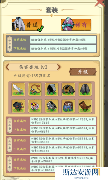 从这里我们不难看出套装是一个递增式的成长装备,我愿称之为最强神器,他是1+2+3式的属性叠加。建议中后期全力梭哈套,稀有套也一样,后续其他没多大用,只有这个套的输出时爆炸式的增长。你们排名所看到的BOSS伤害,基本都是全套加4加5的,BOSS输出加成我估计都几百了,攻击面板都是几百万起步的,这个白嫖玩家慎重,因为你没有强化石来源,就算你花了几百万元宝凑齐了一套稀有,没有强化石等于没用!