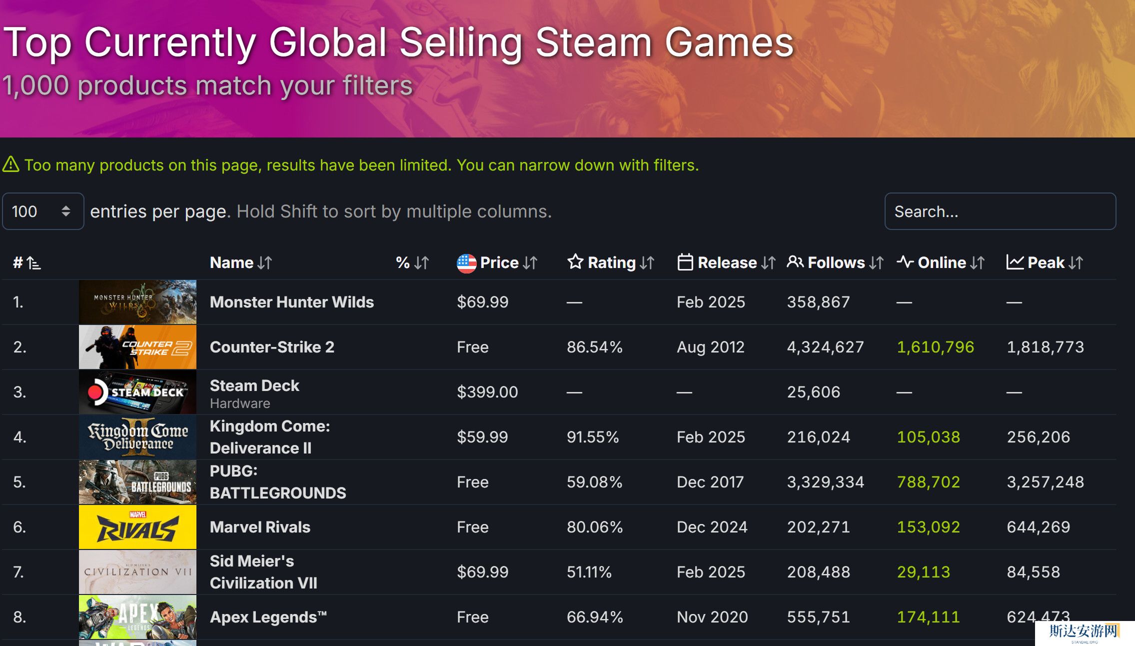 据SteamDB数据显示,《怪物猎人:荒野(Monster Hunter Wilds)》在Steam平台上已成为按收入计算的最畅销游戏,这一成就竟是在该游戏尚未正式发售、仅凭预购销量就达成的。