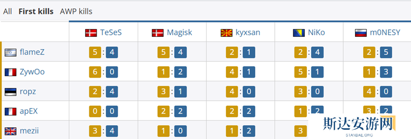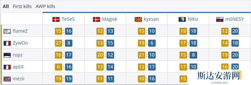 总击杀层面,ZywOo“打崩”了TeSeS与kyxsan,与NiKo、Magisk不分伯仲,稍逊于m0NESY。apEX面对Faclons四人都处于下风,但唯独对位NiKo时占据优势,后者在决赛的发挥不尽人意。m0NESY对位中只稍落后于mezii,其余则是占据优势。