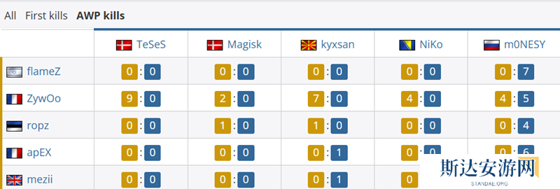 两位狙击手在狙杀对比中相差不大,m0NESY以5:4略胜ZywOo一筹。狙杀总数方面,ZywOo狙死了对面26次,m0NESY则是28次,也相差不大。