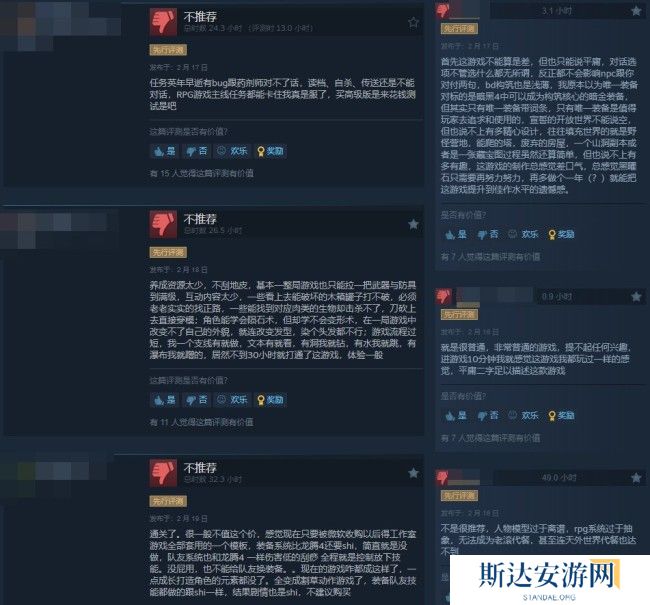 不过,也有部分玩家指出游戏仍有不少值得改进的地方。例如,怪物种类较少,技能树系统显得过于简陋,缺乏足够的深度。此外,部分任务NPC的对话仍然存在Bug,导致游戏体验受到影响。而在养成系统方面,一些玩家认为资源获取较为受限,无法给予角色足够的成长空间,这使得RPG元素略显单薄。此外,部分玩家对游戏的画面表现感到不满,认为建模质量较低,人物造型欠缺细节,影响了整体的沉浸感。