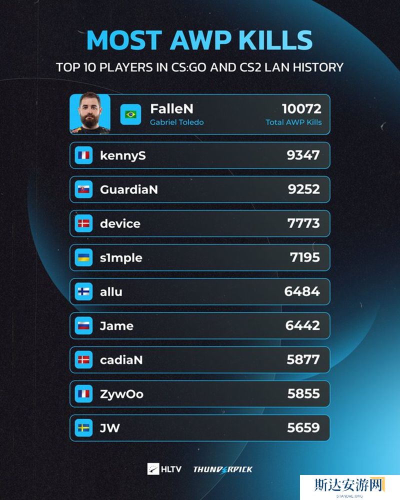 HLTV分享了一份关于巴西传奇选手FalleN的数据。在CSGO和CS2新版本线下赛中,FalleN的AWP击杀数已经达到了10072,超越第二名kennyS 725个人头。