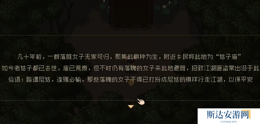 第二个就是江湖路线,玩家在江湖游历过程中,来到姑子庙这个场景,在这里会触发一段剧情,看到麻姑身处困境,面临一些歹人的骚扰或是危险处境,面对麻姑的困境,游戏会给出几个不同的对话选项,玩家务必谨慎选择,只有挑选了代表正义、善良且愿意救助她的选项,才能成功救下麻姑,同时自身的道德值也会因此提升,这一步为后续麻姑的加入奠定基础,成功救下麻姑后会对玩家心怀感激,并告知玩家一些后续的线索或请求。