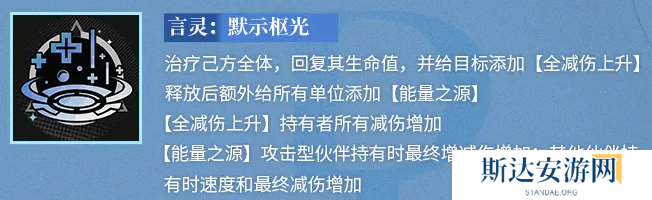治疗己方全体,回复其生命值,并给目标添加[全减伤上升]释放后额外给所有单位添加[能量之源]