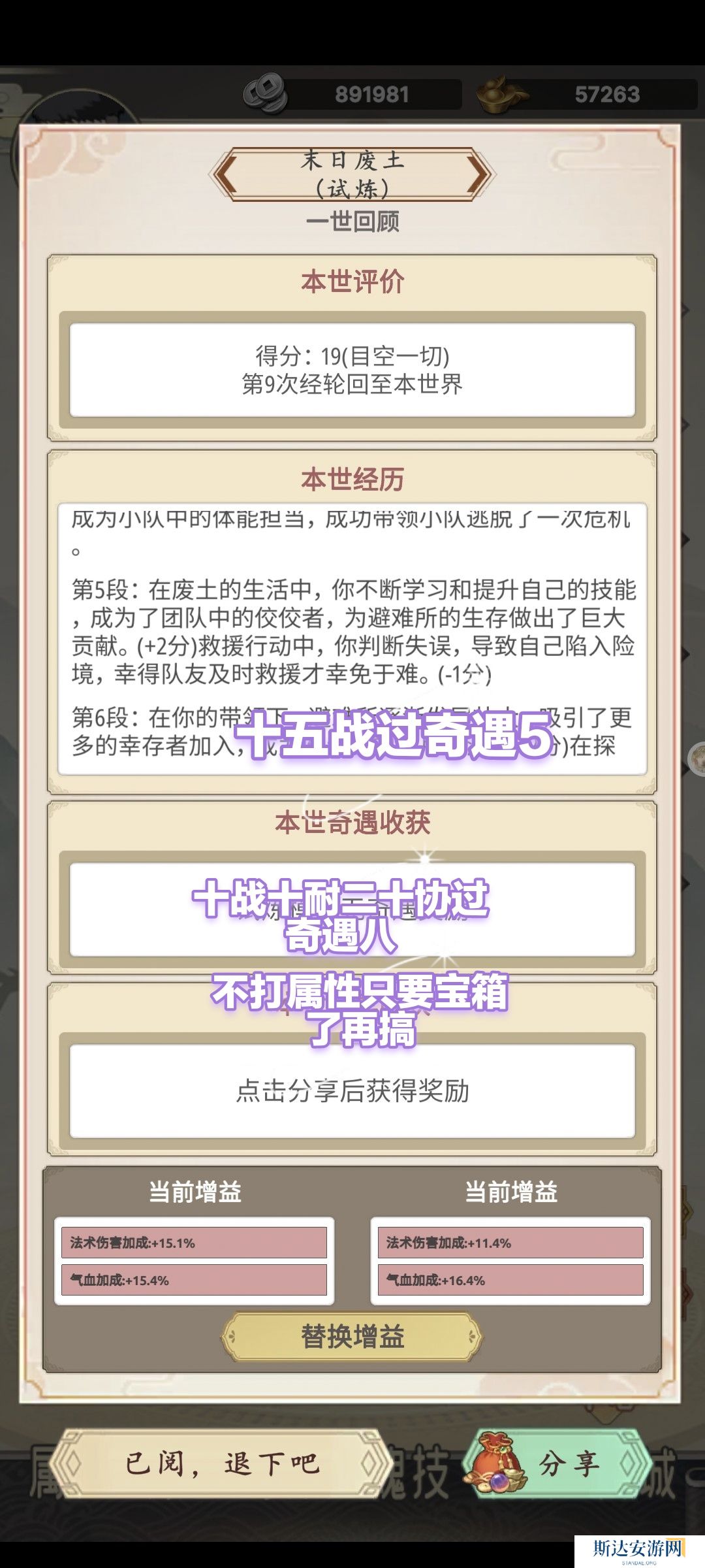 在《穿越万世轮回》这里玩家可以体验人生模拟,超过世界可以选择,玩家可以自由的在奇幻的世界中进行穿越冒险。下面是“星满楼-小冉”给大家带来的《穿越万世轮回》轮回世界二奇遇宝箱加点推荐,感兴趣的小伙伴们一起来看看吧。