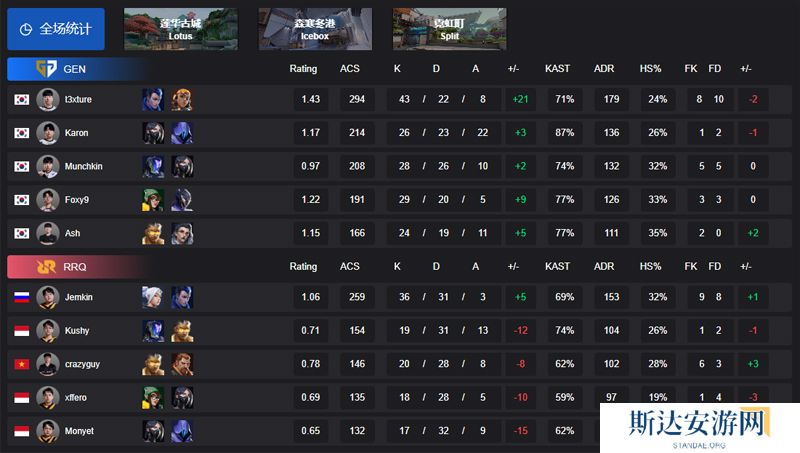 2025 VCT 太平洋联赛第一赛段,胜者组决赛,GEN直落两图击败了RRQ,挺进总决赛。图一莲花古城,GEN 13:5 RRQ,图二森寒冬港,GEN 13:8 RRQ。t3xture选手拿到了全场最高的43总击杀。