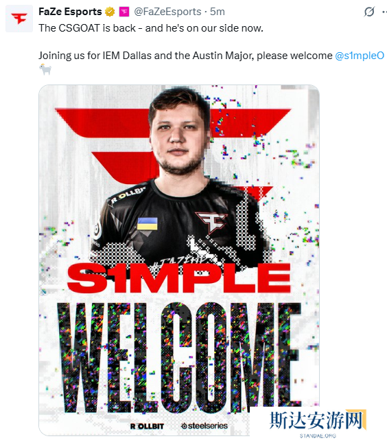 FaZe于官推宣布临时租借乌克兰传奇选手s1mple,以备战奥斯汀Major。