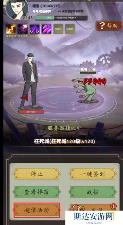 2在挂完了1万胜利的每日任务后,就可以考虑越级打怪了,手动刷到一个怪慢慢刷,在能打死的情况下,不想手动就离线1-2小时之间上线看一下,换一下装备,接着推下一个地图,直到达到了50**的要求就可以一直挂机了。