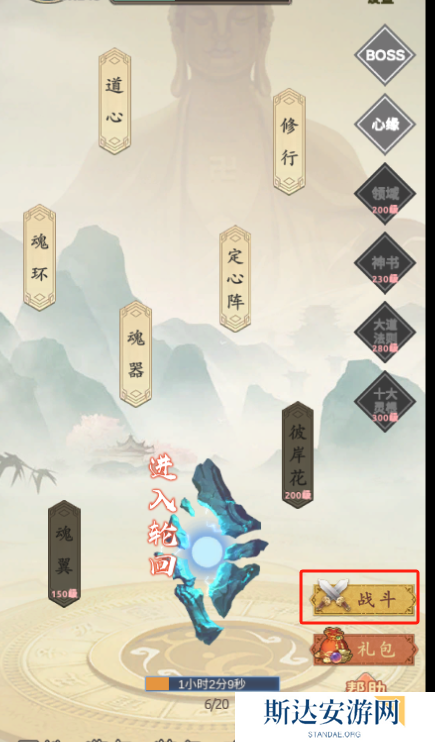 2、直接去商城把 所有的广告免费道具都领完,来到游戏的主界面,点击背包,把兑换码送的金灵心激活,激活了这个就可以实现24小时离线挂机了。