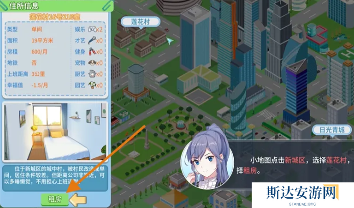 在弹出的窗口马上就可以看到租房的选择,在点击之后就会有对应的具体信息展示。例如不同房源的租金或者是房型会有多个不同的房源可供选择,玩家可以根据个人在游戏中的角色需求以及资金情况,然后去做出选择,相对来说是比较轻松的。