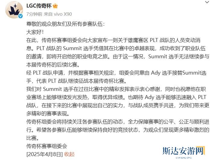 在此,传奇杯赛事组委会向大家宣布一则关于雄鹰赛区 PLT 战队的人员变动消息。PLT 战队的 Summit 选手凭借其在比赛中的卓越表现,成功收到了职业队伍的邀请,即将开启他的职业电竞之旅。由于这一情况,Summit 选手无法继续参与本届传奇杯的后续比赛。