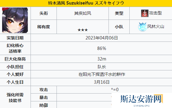 铃木清风:在普通攻击之后,就可以针对敌方的目标造成对应比例的伤害,在战斗开始时同样也可以提升输出的能力,可以获得永久的自身机动力。