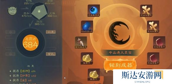 先放2份灵物,然后补充坚固属性的矿石和操控属性的牙骨。这就是2灵物、4矿石、4牙骨的组合。其余的组合方式同理。