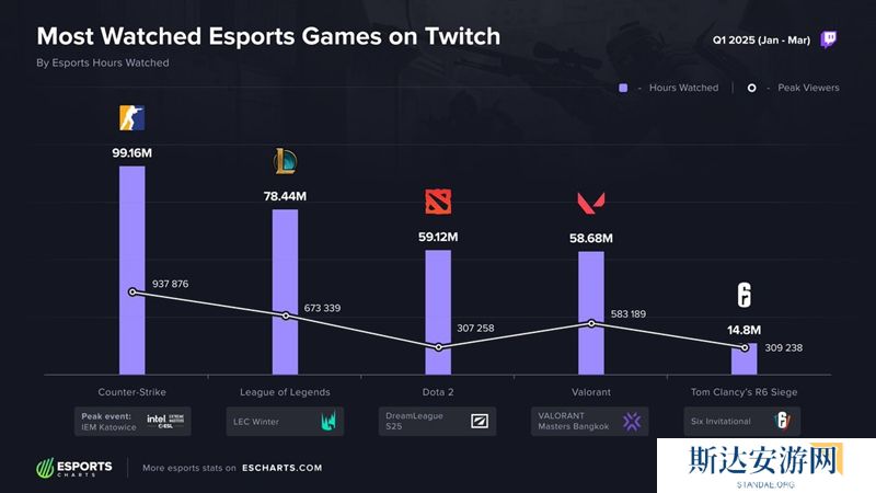 2025年第一季度Twitch上观看量排名前五的电竞项目还包括Dota 2(5912万小时观看时长)、无畏契约(5868万小时观看时长)和彩虹六号:围攻(1480万小时观看时长)。