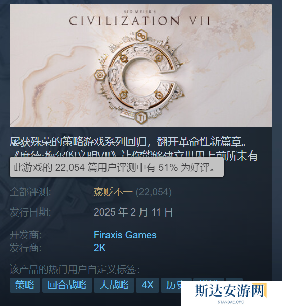 值得一提的是,《文明7》在 Steam平台的全部评测为“褒贬不一”,22054条用户评测中,好评率仅为51%。