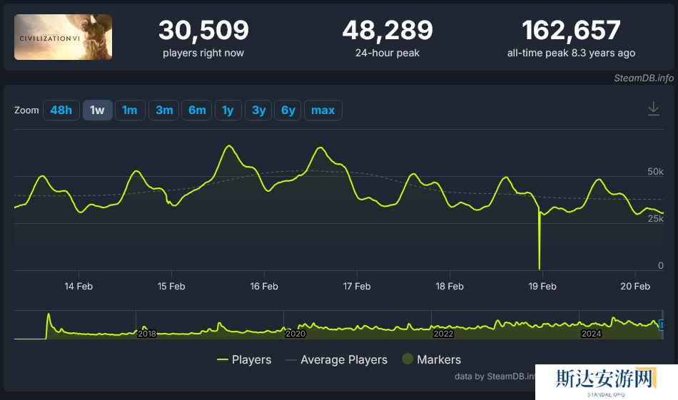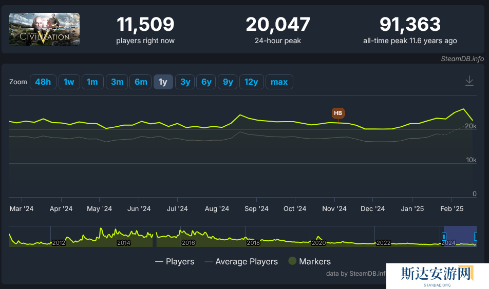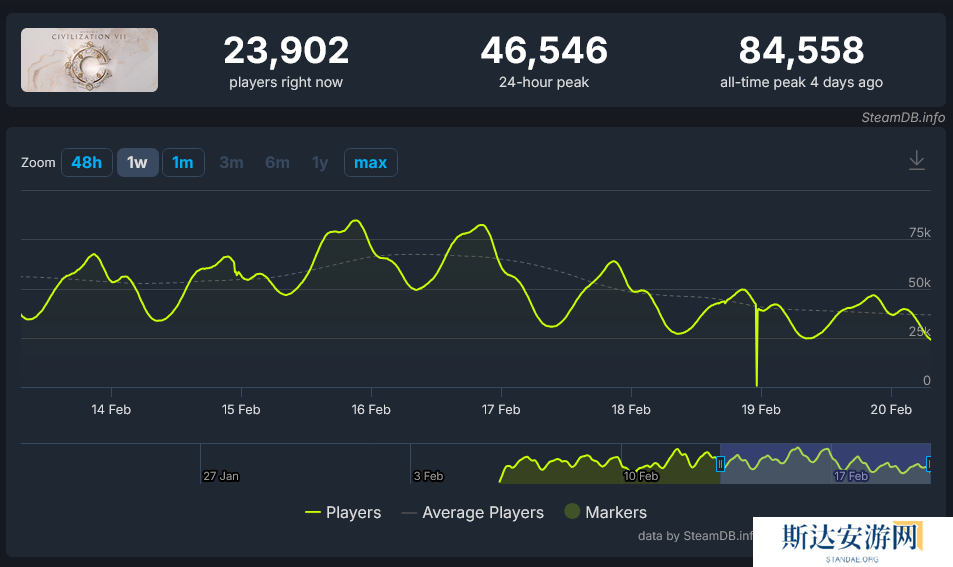 根据SteamDB数据显示,《文明7》同时在线峰值为84,558人,而《文明5》为91,363 人,《文明6》则达到了 162,657 人。其中,《文明5》发布于11年前,其峰值同时在线人数已超过当前的记录。