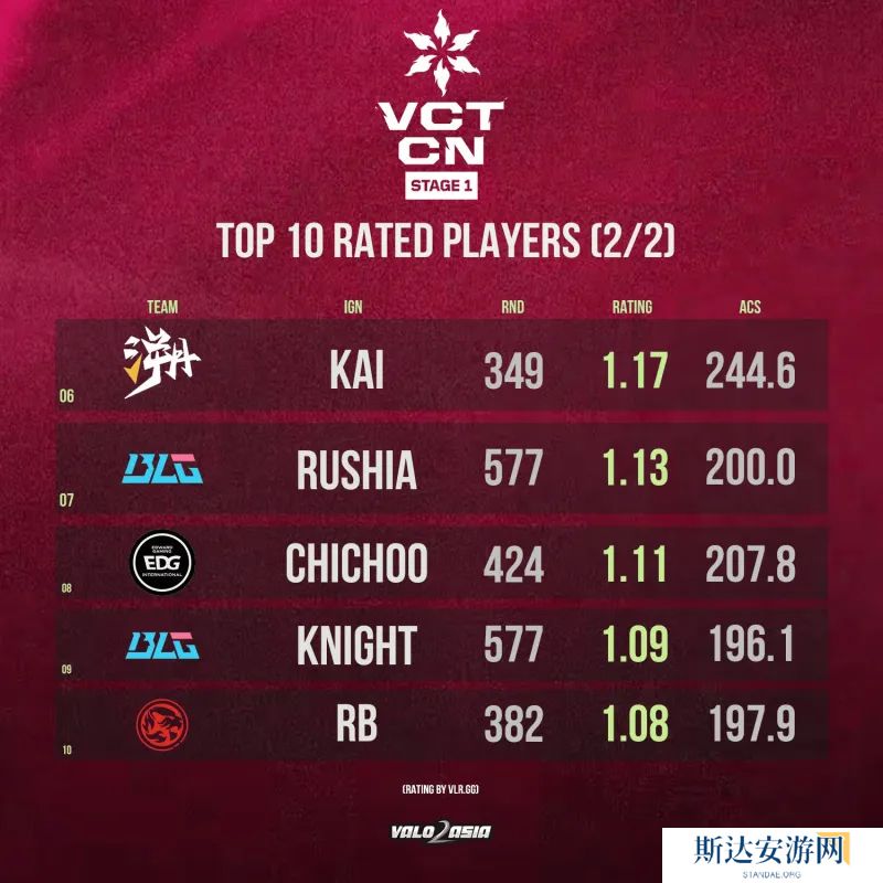 外媒统计了2025VCT CN第一赛段Rating排名前十名的选手,以下是具体排名: