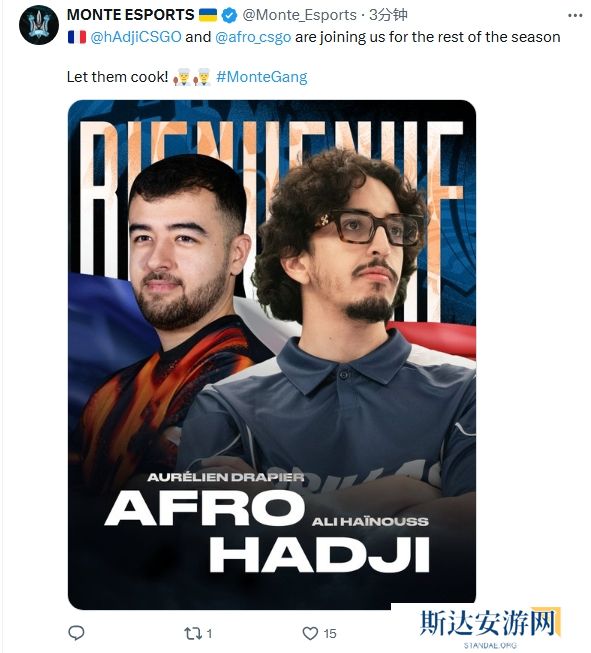 Monte战队在社交媒体官宣签下两位法国选手hAdji和afro。