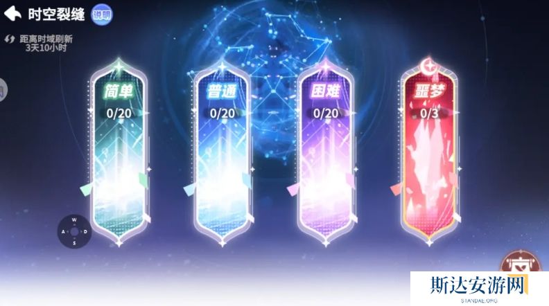这时大家就可以利用飞翔石的多段跳跃技能,从左边跳到右边再从右边跳回左边即可躲避怪物攻击,如果中途不幸死亡,只需在原地复活即可继续挑战,这里有个小窍门是复活有倒计时,可以在倒计时还剩最后2-3秒时再复活哦,而噩梦难度下的水晶保卫战是时空裂隙中的最后一个挑战,这三个难度级别采用统一模式,但需要玩家提升战力才能守护更高难度的水晶。