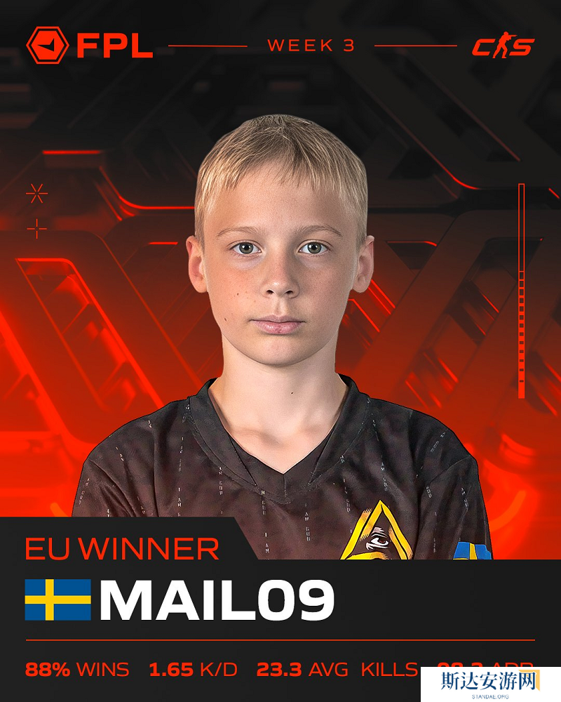 年仅15岁的MaiL09以88%胜率,1.65 K/D,23.3的平均击杀数和98.2的ADR登顶FPL欧洲榜,完成了自己在FPL的首秀。