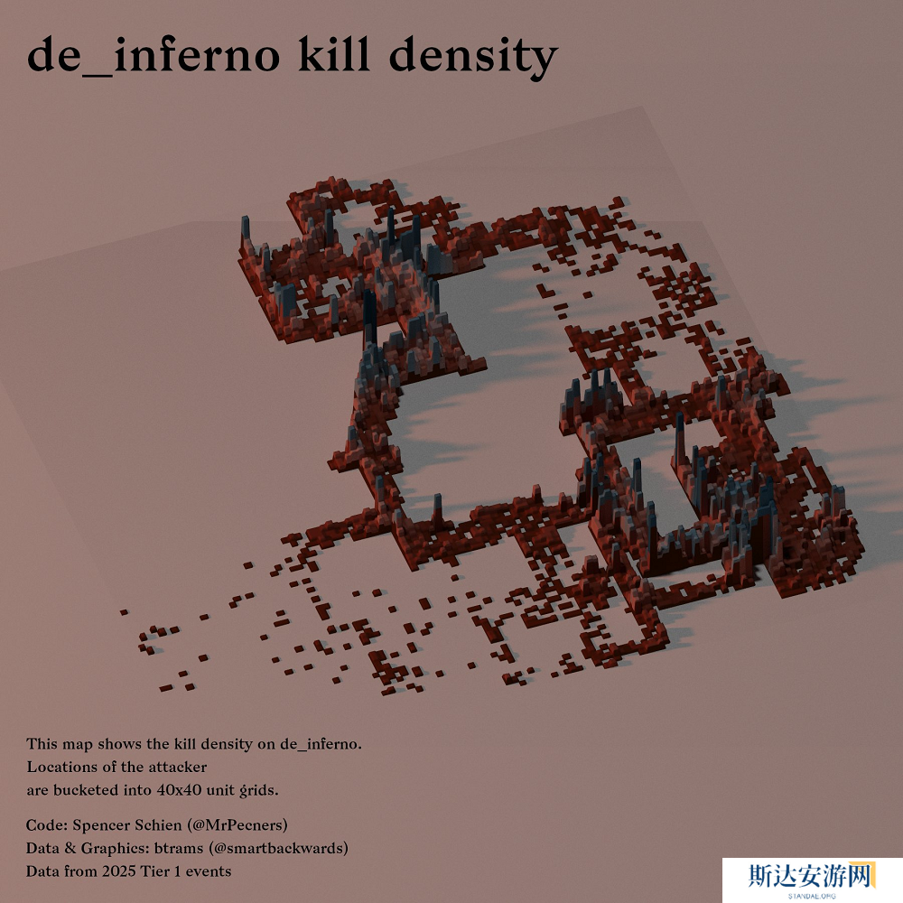 近日,国外数据分析师btrams与其他数据爱好者合作又制作了一份Inferno各点位击杀可视化密度分布图,该图可供读者非常直观的了解炼狱小镇地图上那些产生击杀最高频的点位。数据统计范围为2025年以来的一线赛事。