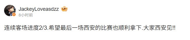 赛后TES下路选手JackeyLove更博:连续客场进度2/3,希望最后一场西安的比赛也顺利拿下,大家西安见!!