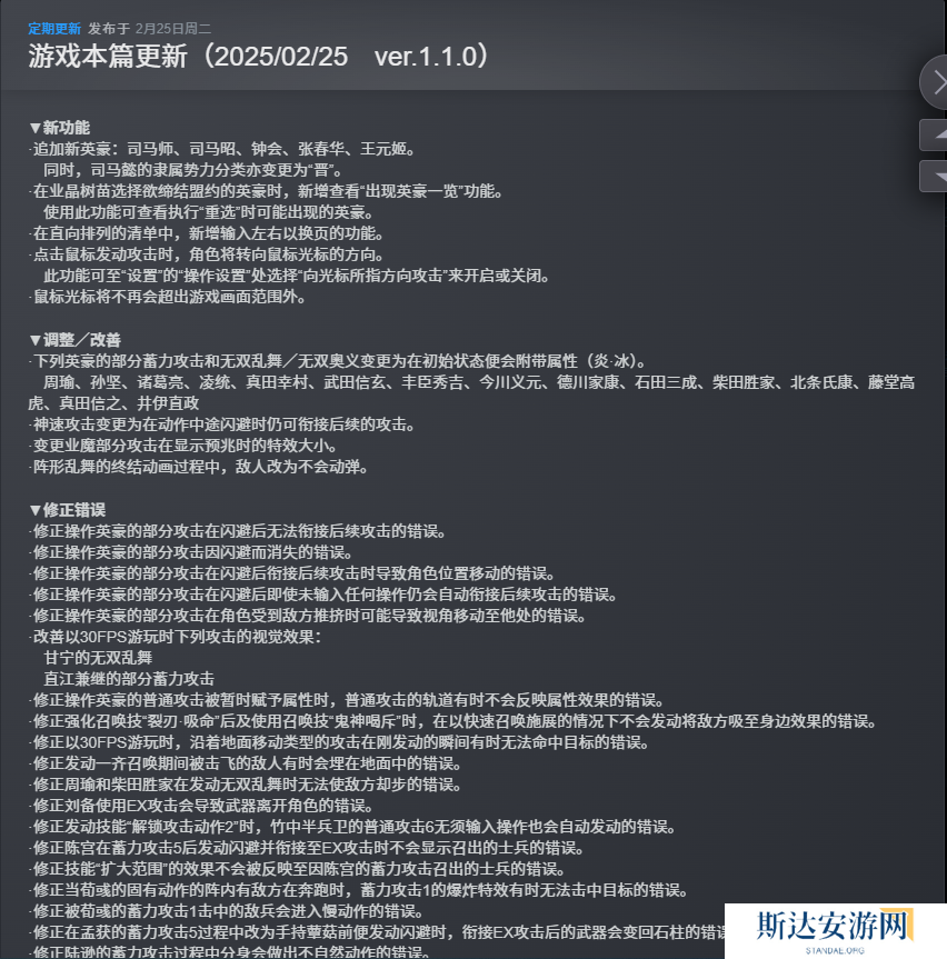 官方也在正式发售之后推送了首个补丁1.1.0,追加了《真三国无双》系列中登场的西晋角色和各种服装。